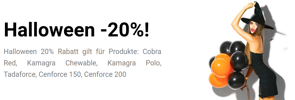 Halloween Ihr Rabattcode: ZPE20 Verwenden Sie nach Auswahl der Produkte den Rabattcode im Warenkorb. Halloween 20% Rabatt gilt für Produkte: Cenforce 200mgBewertet mit 4.50 von 5 Unverified overall ratings 21,00 € Cenforce 150mgBewertet mit 4.17 von 5 Unverified overall ratings 29,50 € Cobra Red 120mgBewertet mit 4.56 von 5 Unverified overall ratings 17,00 €